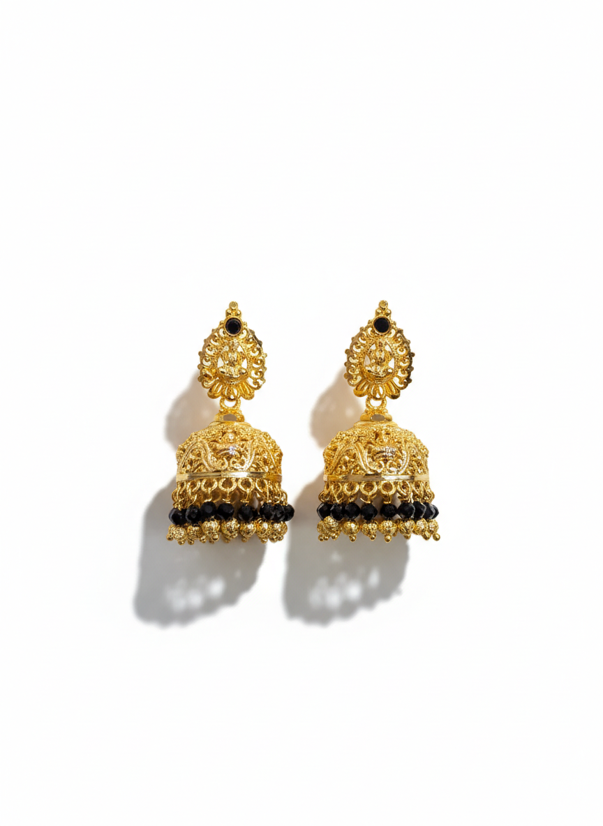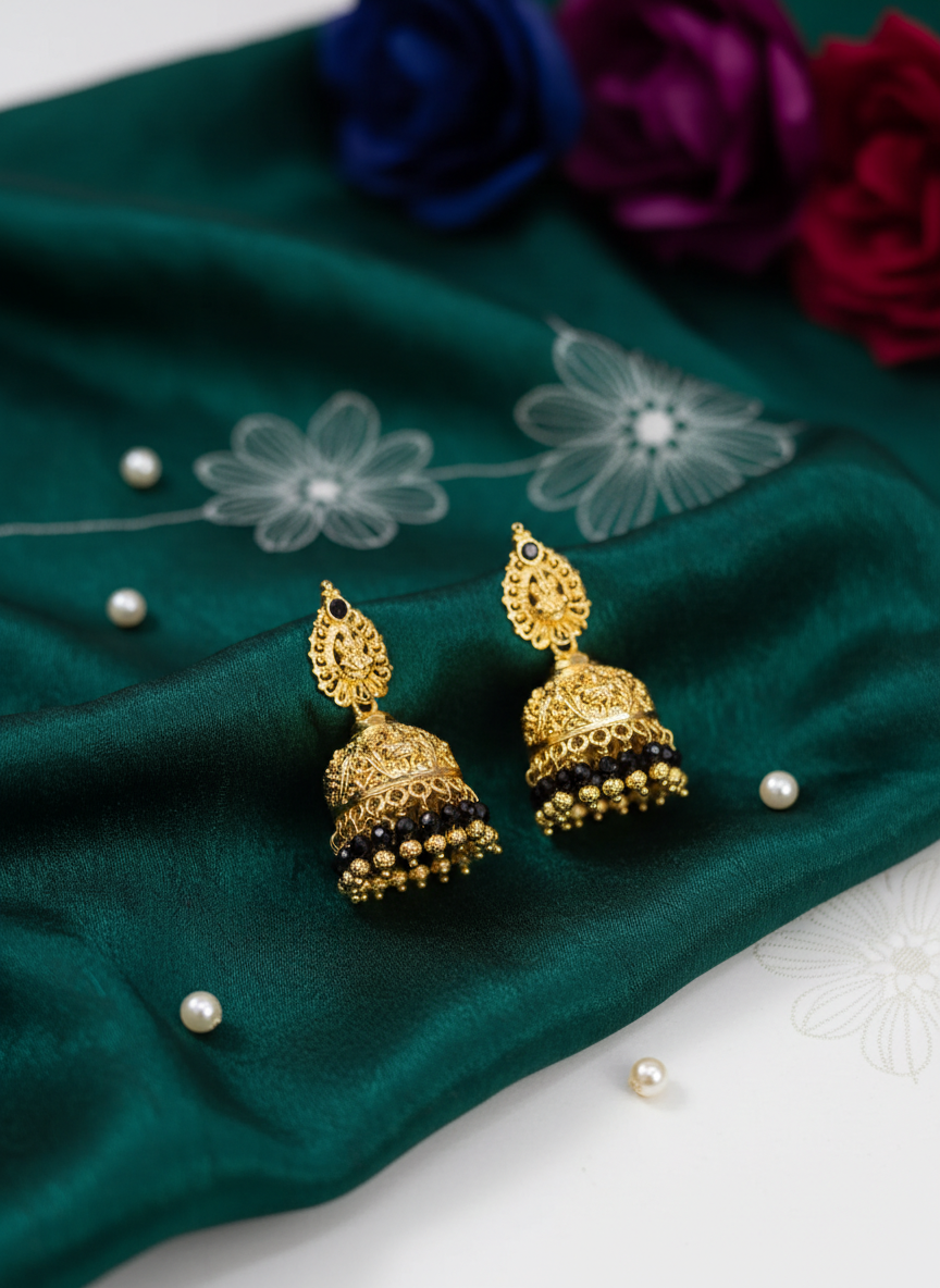 While traditional temple jewelry often uses rubies (Kemp stones), these earrings utilize polished black beads. This modern twist serves two purposes: