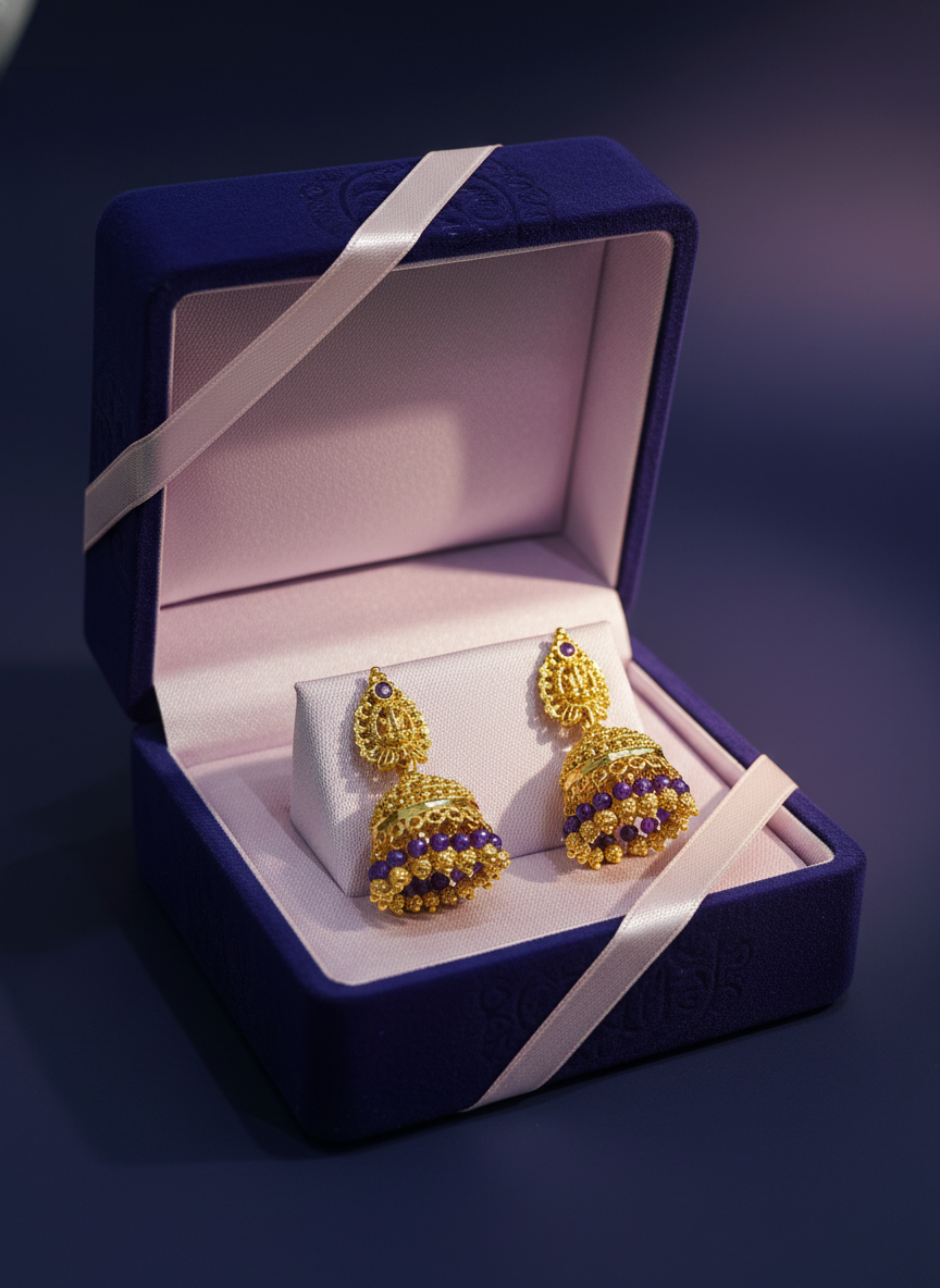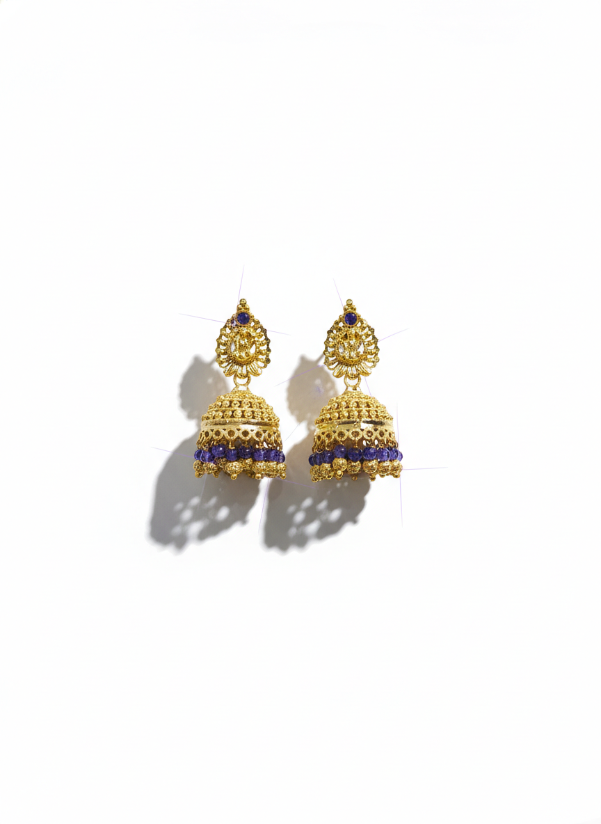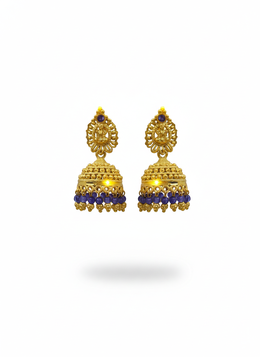 Lakshmi Devi Purple Stone Gold Temple Jhumka Earrings Traditional Gold Temple Jhumka Earrings. These stunning bell-shaped earrings, deeply rooted in South Indian heritage, are more than just jewelry; they are a tribute to timeless craftsmanship and divine beauty. Designed for the modern woman who cherishes her roots, these antique finish jhumkas feature intricate temple carvings and vibrant purple beads that add a royal touch to any festive ensemble.