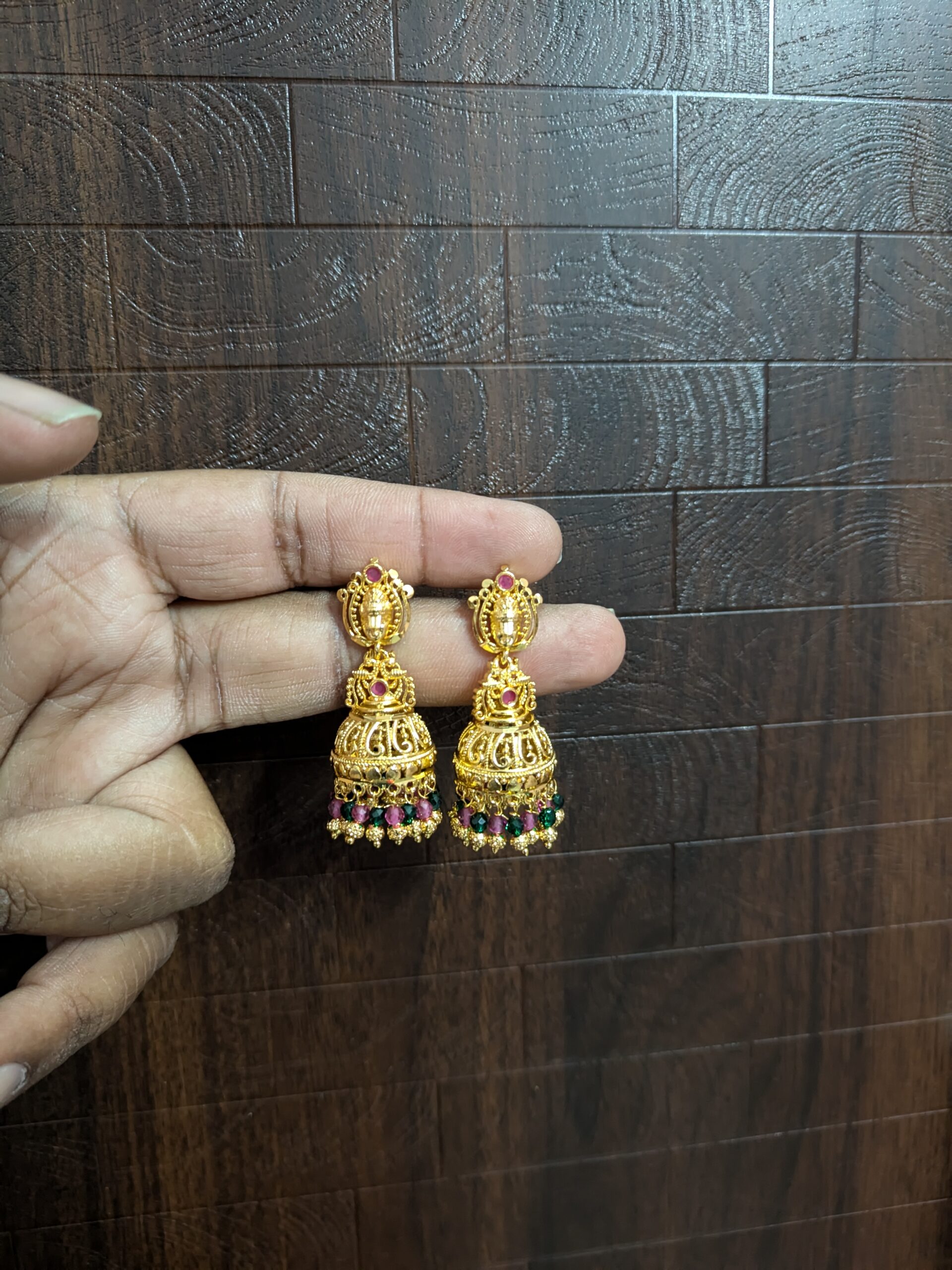 Ruby Pink: Symbolizing passion and prosperity. Below these colorful beads hang tiny golden spheres (drops) that provide a gentle, melodic clinking sound with every turn of your head—a signature feature of authentic jhumkha earrings.